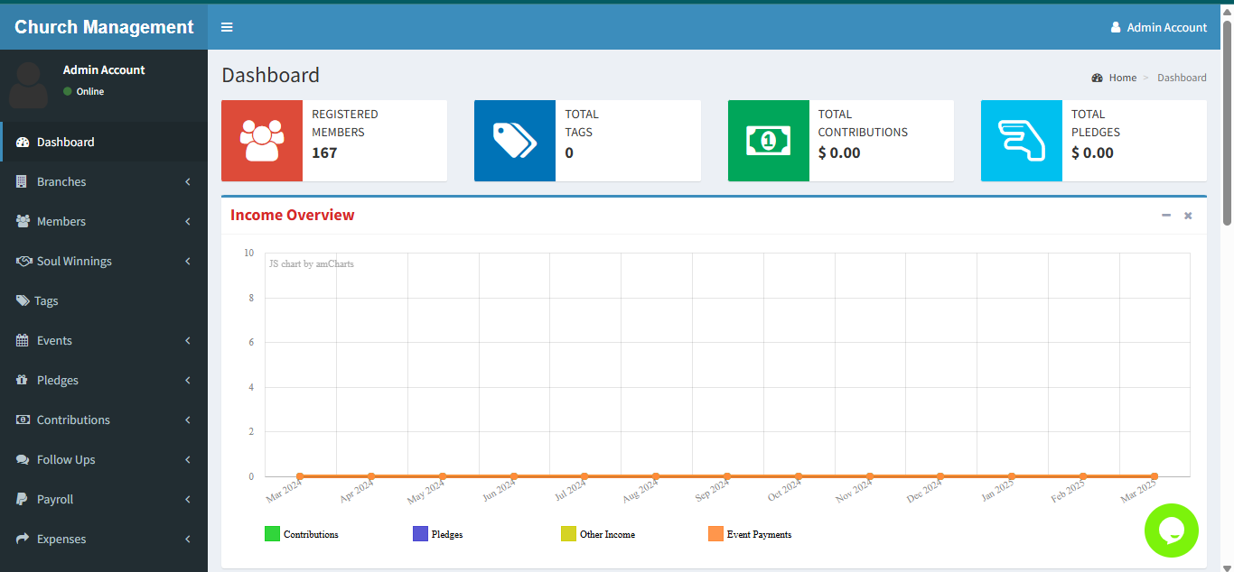 A Church Management System oversees various aspects of church operations, including managing branches, handling payroll, tracking pledges and contributions, facilitating SMS broadcasting.